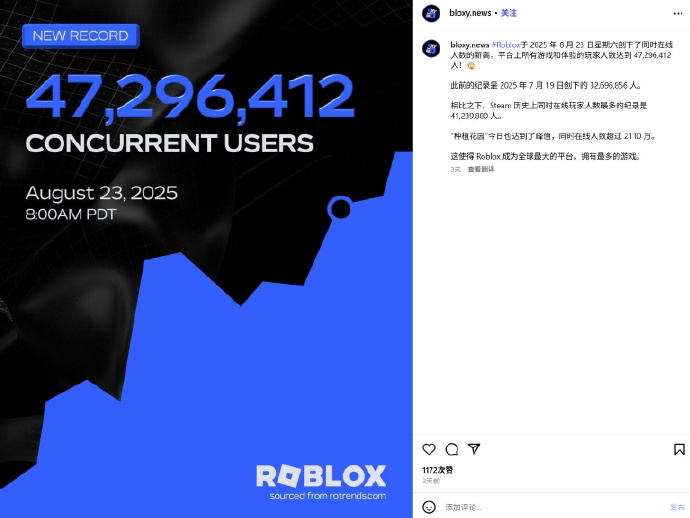 据外媒Wccftech消息,上周六,Roblox创下了该游戏平台同时在线用户的新纪录:8月23日,Roblox在线用户数量达到4730万。这比Valve旗下Steam平台3月份创下的4120万同时在线用户峰值高出610万。