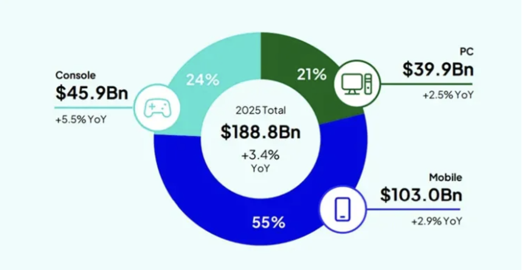 竞核9月11日消息,主机市场成2025年游戏增长主引擎:据Newzoo最新报告,2025年全球游戏市场收入预计同比增长3.4%,达1888亿美元。其中,主机市场以5.5%的增长率成为行业增长主引擎,收入将达459亿美元,超越PC增幅(增长率2.5%,收入将计399亿美元)。移动游戏将以1030亿美元,继续稳居第一。