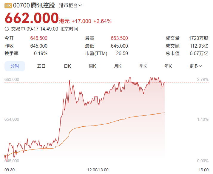 竞核9月17日消息,腾讯总市值重回6万亿港元:今日港股开盘后,腾讯控股股价涨幅超2.5%,截至目前,股价来到662港元,市值重回6万亿港元。腾讯股价最高点出现在2021年2月,当时其股价触及773.90港元/股(前复权),对应市值高达7.44万亿港元(相当于9490亿美元)。随后受市场环境影响,腾讯股价持续走低,一度跌至170港元。此后三年,腾讯股价触底回升,至今涨幅达290%。
