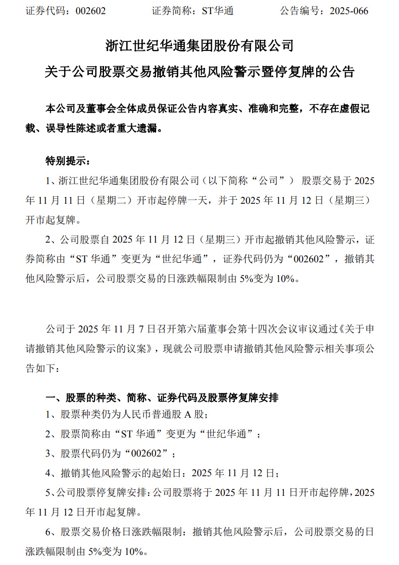 竞核11月11日消息,世纪华通明日摘帽ST:世纪华通发布公告称,公司股票将于2025年11月11日开市起停牌一天,11月12日开市起复牌并正式撤销其他风险警示,证券简称由 “ST 华通” 恢复为 “世纪华通”,股票交易日涨跌幅限制将由5%恢复至10%。