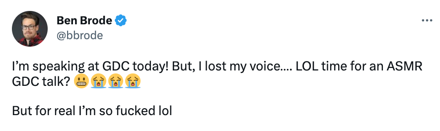 “I'm speaking at GDC today!But,I lost my voice ……LOL time for an ASMR GDC talk?But for real I'm so fucked lol.”
