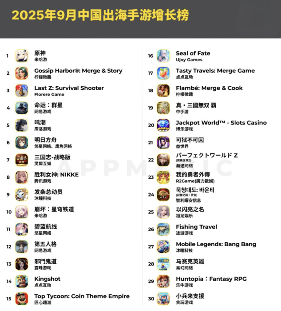 竞核10月22日消息,《原神》9月出海收入环比增长67%:据AppMagic最新数据,2025年9月中国出海手游市场表现活跃,多款产品通过版本更新与精细化运营实现收入增长。收入榜前三保持稳定,网易新作《命运:群星》凭借GP版本贡献首月分成后收入约700万美元,新晋入围榜单。《原神》以6.0版本强势回归,分成后收入约2000万美元,环比增长67%,位列增长榜榜首。