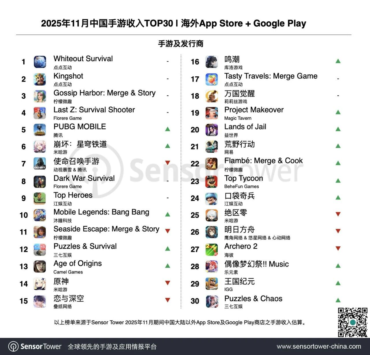 竞核12月11日消息,点点互动两款SLG领跑11月出海榜:Sensor Tower报告显示,2025年11月前后头部手游普遍抓住万圣节、黑五与感恩节等关键节假日窗口,通过高密度的运营活动有效撬动玩家消费,推动收入持续走高。点点互动龙头产品《Whiteout Survival》和《Kingshot》继续强势包揽出海手游收入榜冠亚军。