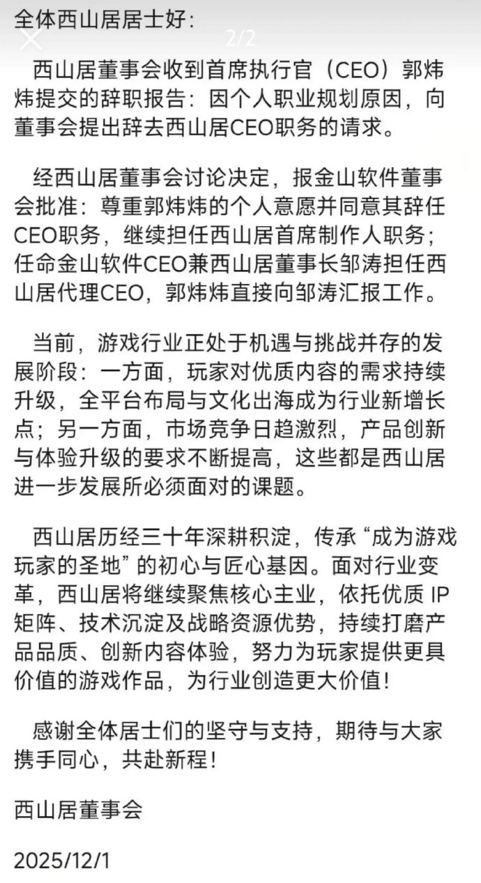 竞核12月1日消息,郭炜炜卸任西山居CEO:今日,西山居内部发布公告,称西山居董事会收到首席执行官(CEO)郭炜炜提交的辞职报告:因个人职业规划原因,向董事会提出辞去西山居CEO职务的请求。