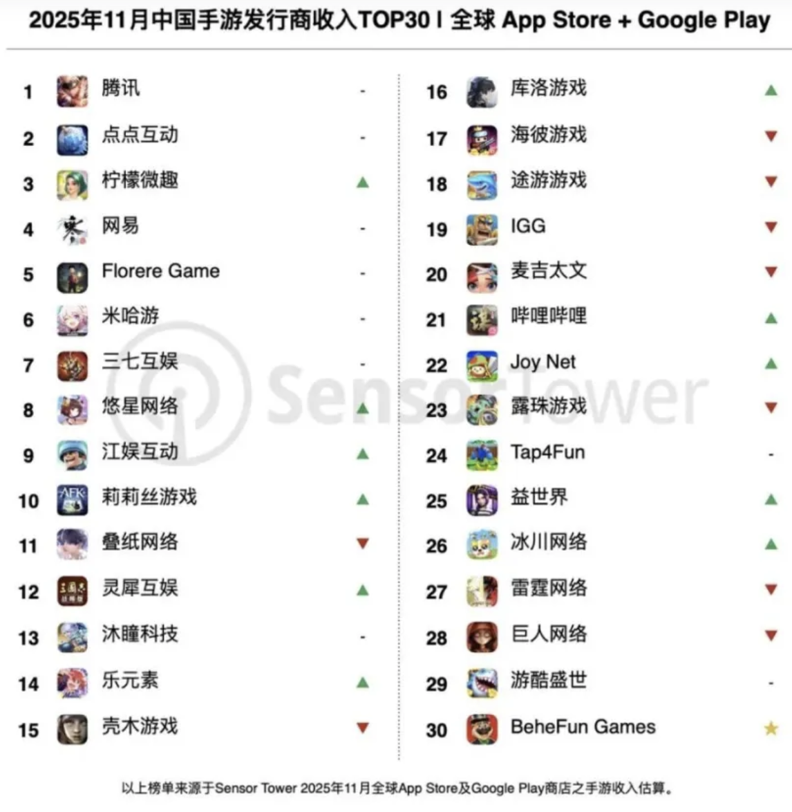 竞核11月8日消息,柠檬微趣跻身全球收入前三:据Sensor Tower最新数据显示,2025年11月共33个中国厂商入围全球手游发行商收入榜 TOP100,合计吸金 19.5 亿美元,占本期全球 TOP100 手游发行商收入 35.8%。其中,腾讯、点点互动稳居全球手游发行商收入榜冠亚军,而柠檬微趣则跻身发行商收入榜第三名。