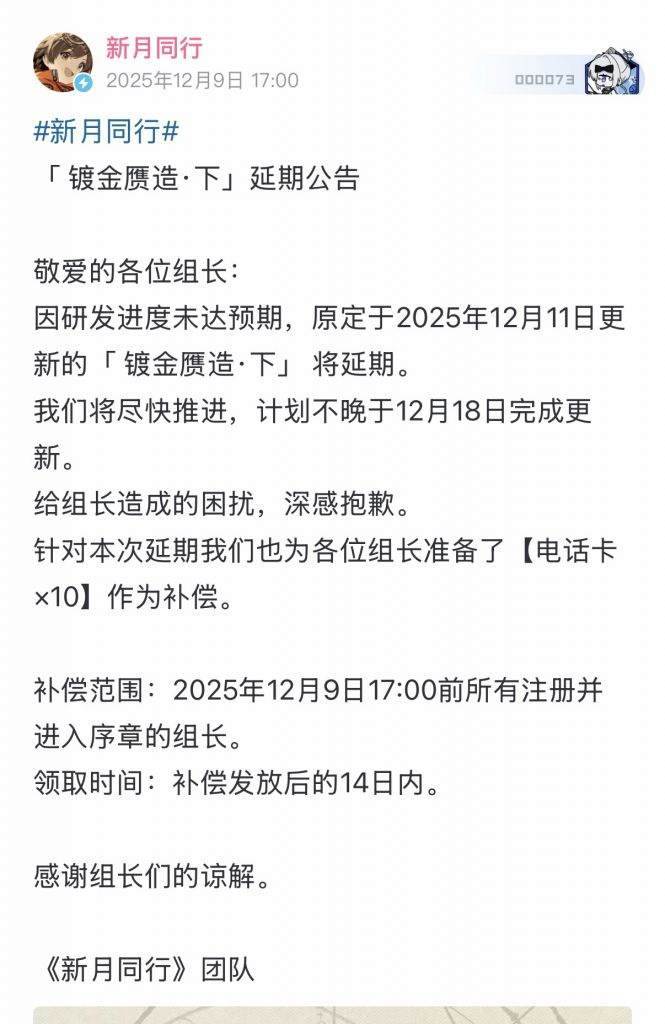 竞核12月8日消息,新月同行因研发进度不及预期推迟新版本