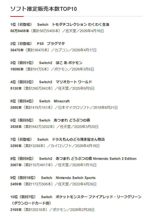 竞核4月24日消息,朋友收集梦想生活首周销量超56万:Fami通公布了2026年4月13日~2026年4月19日期间的日本地区游戏销售榜。