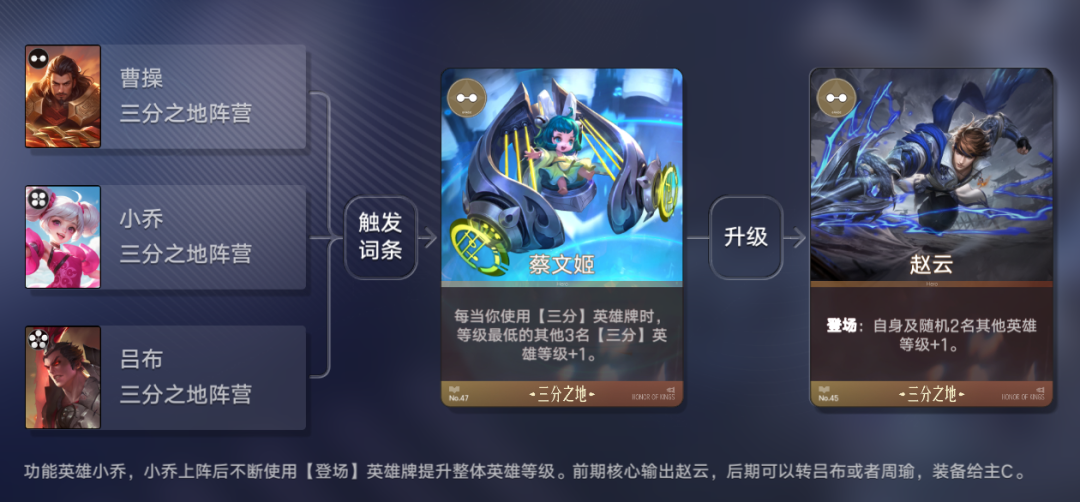 以笔者常用的“三分之地”为例,其中觉醒后貂蝉的登场效果能让同阵营英雄等级+2。赵云则能给自身和随机两位英雄等级+2,曹操的整备效果能随机触发2名同阵营的登场效果,而小乔则是每当英雄触发登场效果时所有英雄等级+1。仅曹操每回合都能固定给团队带来共25级以上的等级提升,其次游戏还存在很多单个阵营的强力效果卡牌。