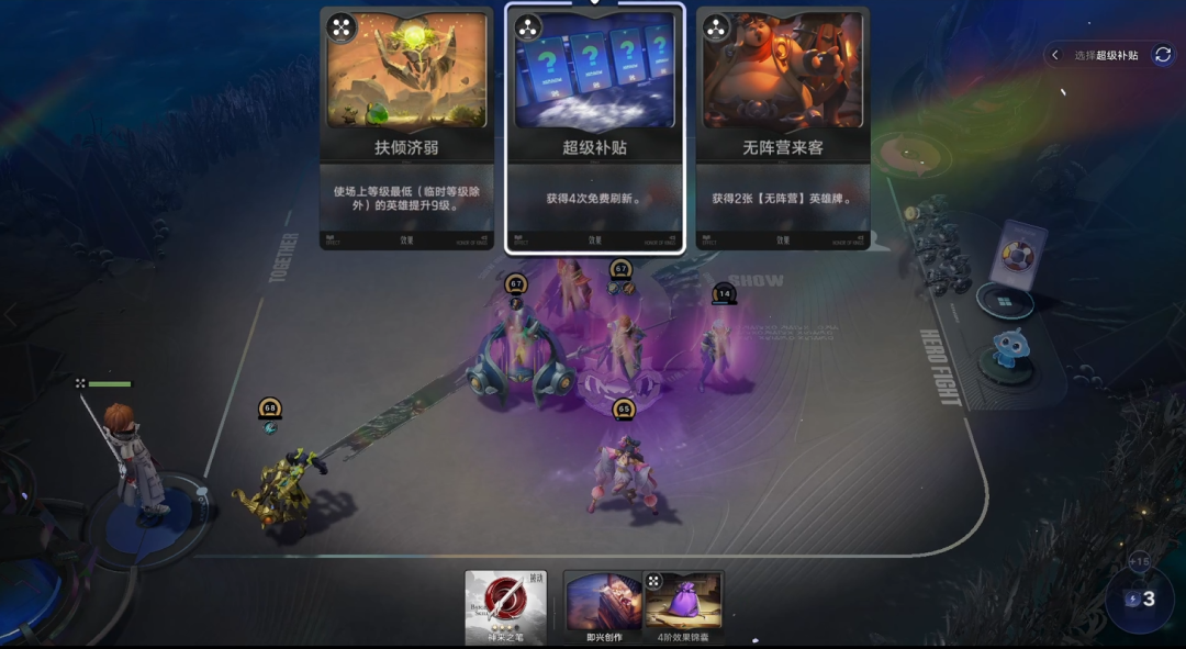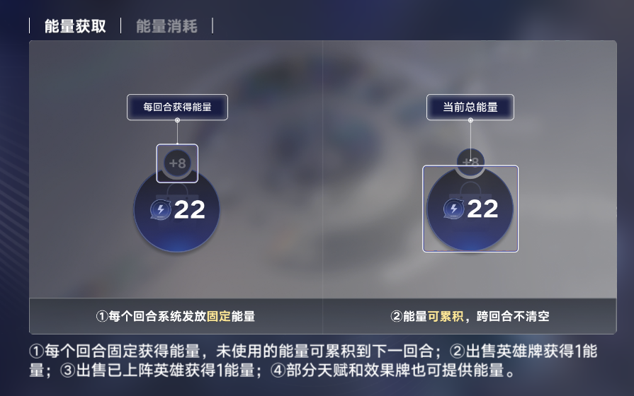 类似的设计同样体现在经济系统上,游戏摒弃了常规的连胜连败奖励及利息结算,采用了酒馆战棋类似的固定能量配给制(前3回合给6点,4-7回合8点,8-11回合12点,12回合后15点),以及全等级英雄统一3块的定价,统一售价,效果牌根据效果不同售价不同的设计。