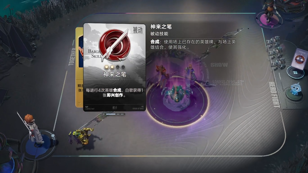 游戏中的棋手(小小英雄)同样有各自的技能,比如白歌可以通过英雄合成获得额外卡牌,瑶可以召唤出肉盾,香香能开局能攻击敌人,常小娥能随机提升英雄等级,这些技能在局内还能不断升级,与特定的阵容搭配往往能发挥出更强的效果。这种单一阵容极为强力的设计正是为了鼓励玩家开局即定阵容,减少玩家游戏中需要思考的内容,从而直接体验到构筑快乐。