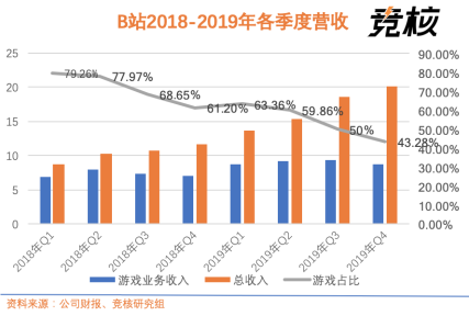 2019年Q4结束时,B站营收增长的势头连续保持了7个季度,游戏收入占比也持续下降,平台内容生态越发平衡。