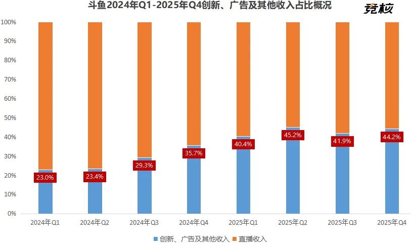 谈及本期斗鱼财报最直接的看点,无疑是利润端转正。 2025年第四季度,斗鱼经营利润、净利润、调整后净利润,三项利润指标同比均实现扭亏为盈。拉长到全年看,公司全年调整后净利润为4016万元,毛利率提升至12.8%。对一家仍处于行业调整期的平台来说,这组数字的意义或许不只是“盈利了”,更多是说明斗鱼已经把平台经营重新拉回到相对稳定的轨道上。 这件事为什么关键?因为过去几年,游戏直播行业最现实的变化之一,就是单纯追求规模的时代已经过去了。很长一段时间里,平台还能靠高投入换增长、靠单点爆发冲数据,但到了今天,这套逻辑已经越来越难成立。直播主业承压,外部环境复杂,用户消费趋于谨慎,这意味着平台必须先把经营底盘稳住,后续的战略动作和内容投入才有空间展开。 斗鱼这次财报的积极信号,恰恰就在这里。正如斗鱼副总裁曹昊在财报中提到,去年第四季度,公司在直播业务承压的背景下,实现了盈利改善与现金流稳健;从全年看,财务效率和可持续性也有明显提升。换句话说,斗鱼并不是在理想环境里完成修复,而是在压力未消失的前提下,把经营质量往上拉了一步。 更值得注意的是,这种“稳住”也不是靠一味收缩换来的。回看斗鱼去年第四季度的实际动作就能发现,平台仍在继续围绕核心优势做内容承接和活动布局。无论是引入高关注度电竞赛事,还是在线下落地“光谷电竞嘉年华暨斗鱼鱼跃杯”等,本质上都在做同一件事:把有限资源放到更具确定性的内容和用户场景里。 斗鱼这一阶段的改善,并不是靠某项业务突然爆发,这背后也对应着一整套效率优化动作,是平台对资源配置、成本结构和运营流程做了更有针对性的调整。这种经营方式,显然比单纯追逐短期规模更重要,它决定了平台能不能在行业波动周期里重新建立“稳定感”。 也正因如此,在竞核看来,斗鱼这次利润端的改善,不只是财报上的一组结果,更像是平台经营修复的阶段性确认。放在当下的游戏直播行业里看,先把经营拉回稳态,本身就是一件有价值的事。 如果说利润端转正说明斗鱼“稳住了”,那么收入结构的变化,回答的其实是另一个更关键的问题:斗鱼接下来靠什么继续往下走。 财报显示,去年第四季度,斗鱼创新、广告及其他收入达到4.058亿元,占总营收的44.2%。从全年看,这一板块在2025年每个季度的收入占比都维持在40%以上。 斗鱼CEO任思敏在财报中也明确表示,创新、广告及其他收入全年同比增长37%,竞争韧性进一步增强,财务可持续性明显提高,为长期发展夯实了基础。可以说,收入多元化和运营效率提升,是过去一年斗鱼最重要的经营成果之一。 其实,斗鱼这几年一直在推进“收入多元化”,但现在它已经不只是一个战略方向,而是开始变成清晰的经营结果。竞核认为,这一点本身就有相当现实的意义。因为游戏直播平台过去长期被质疑的一点,就是商业模式过度依赖传统直播收入。一旦行业环境波动,压力就会迅速传导到平台业绩上。 斗鱼现在释放出来的变化在于,它已经不再只靠单一收入项支撑平台运转,而是在逐步搭建一个更有韧性的收入骨架。创新、广告及其他收入连续四个季度维持在四成以上,本质上就是平台收入结构开始变得更健康的直接体现。 当然,斗鱼这一轮多元化也不是脱离平台原有特质去生硬扩张,而是围绕自身核心能力做延展。比如财报提到,公司广告业务回升明显,游戏会员业务增长态势良好,语音业务稳健推进。其中,语音社交业务在第四季度实现收入2.71亿元,已经成为多元化收入的重要支撑项。 这意味着,斗鱼的战略转向,并非简单意义上的“多做几项业务”,它是在重新梳理内容、用户兴趣、社区互动和商业化之间的连接关系。 这一点,其实也能从斗鱼此前的运营案例里看得更清楚。比如“斗鱼×和平精英雪赚月福利活动”,就不是一场孤立赛事,而是一整套围绕热门游戏内容搭建的用户运营框架。这项活动除“Allstar邀请赛”外,还叠加了多种互动玩法,把赛事内容、主播流量和用户参与放进了同一个场景。 它背后的逻辑并不复杂:平台不该只让用户来看一场直播,更需要将其打造成一个能让用户持续停留、持续互动的内容节点。 再比如斗鱼在12周年之际完成品牌升级,也不只是一次视觉更新。围绕新Slogan“看见每种热爱”,斗鱼同步推出动画短片、主播“热爱代言人”企划,以及“鲨鱼魔改大赛”、“火箭摇舞蹈挑战赛”等互动活动。表面看这是品牌动作,实际上它是把“兴趣导向”从一句口号,真正落到用户可感知的内容体验和社区氛围里。 对今天的直播平台来说,多元化能不能成立,关键从来不在于多了几项收入,核心还是平台有没有能力把内容、互动和商业场景重新组织起来。而斗鱼去年这一系列动作刚好体现的就是这种能力。过去一年里,斗鱼一直在把内容运营、用户互动、品牌表达和商业场景重新接起来,不再强调“直播平台”这一单一身份,将重心放在了强化用户兴趣、平台陪伴感和社区参与感。 竞核认为,这种建立在平台核心能力基础上的多元化,才更像一种长期能力,而不是阶段性的补位。换句话说,斗鱼收入多元化的背后,并不只是业务项变多了,更重要的还在于平台正在形成一套更适应当前行业环境的新经营框架。也正因为如此,这部分收入能够连续多个季度站稳四成以上,才更有含金量。 当然,