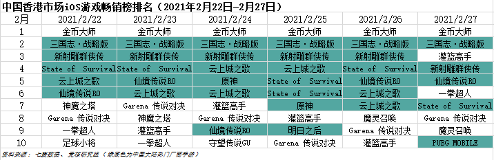 中国香港市场2021年2月22日—2月27日IOS游戏类畅销榜中,《三国志·战略版》与《新射雕群侠传》再次全周打卡第二、三名。
