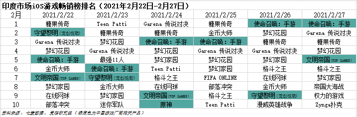 2021年2月22日—2月27日印度IOS游戏类畅销榜中,腾讯《使命召唤:手游》表现抢眼,已经实现了26、27两日霸榜,按照目前趋势来看,可能下周还会继续。