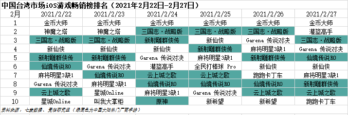 中国台湾市场2021年2月22日—2月27日IOS游戏类畅销榜中,呈现格局与香港地区类似,阿里、富春、三七在榜单前五平分秋色,但《云上城之歌》本周排名下滑严重,或许在下周便难以停留在Top10之中。