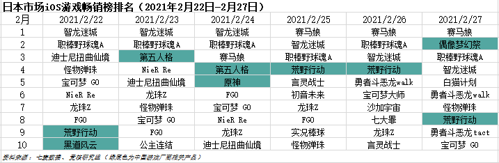 日本2021年2月22日—2月27日IOS游戏类畅销榜中,网易、米哈游、友塔网络、乐元素均有产品入榜。