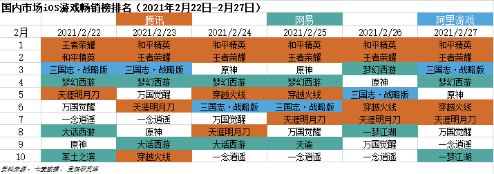国内市场2021年2月22日—2月27日IOS游戏类畅销榜中,腾讯系产品的统治力仍旧惊人,但细节部分略有调整。