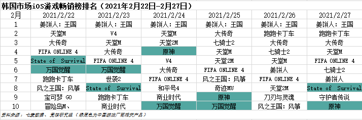 2021年2月22日—2月27日韩国IOS游戏类畅销榜中,米哈游、莉莉丝、FunPlus皆有产品入榜。《原神》成为本周韩国市场表现最好的国产手游,最高位列第四名。