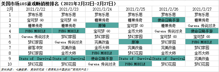 2021年2月22日—2月27日美国IOS游戏类畅销榜中,腾讯《使命召唤:手游》《PUBG MOBILE》、米哈游《原神》、FunPlus《State of Survival》进入榜单前十。其中,《使命召唤手游》一度拿下榜单第二,紧追榜单霸主《罗布乐思》。