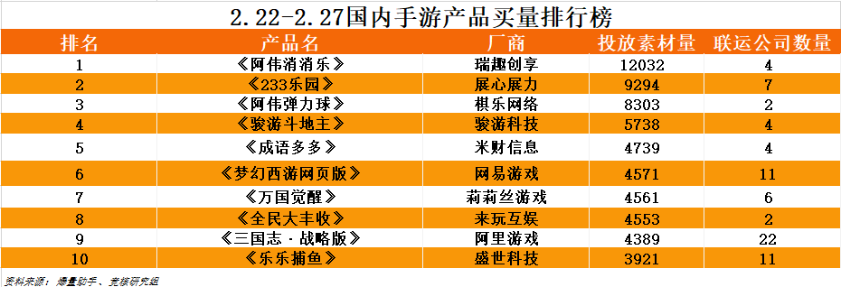 DataEye数据显示,本周买量第一的仍旧是瑞趣创享旗下的《阿伟消消乐》,以12032的投放素材量碾压其他产品。网易《梦幻西游网页版》也不落下风,本周拿下买量榜第六之位。莉莉丝《万国觉醒》与阿里《三国志·战略版》两款SLG游戏为维持用户,买量依旧凶猛,分别位列买量榜第七、九名。