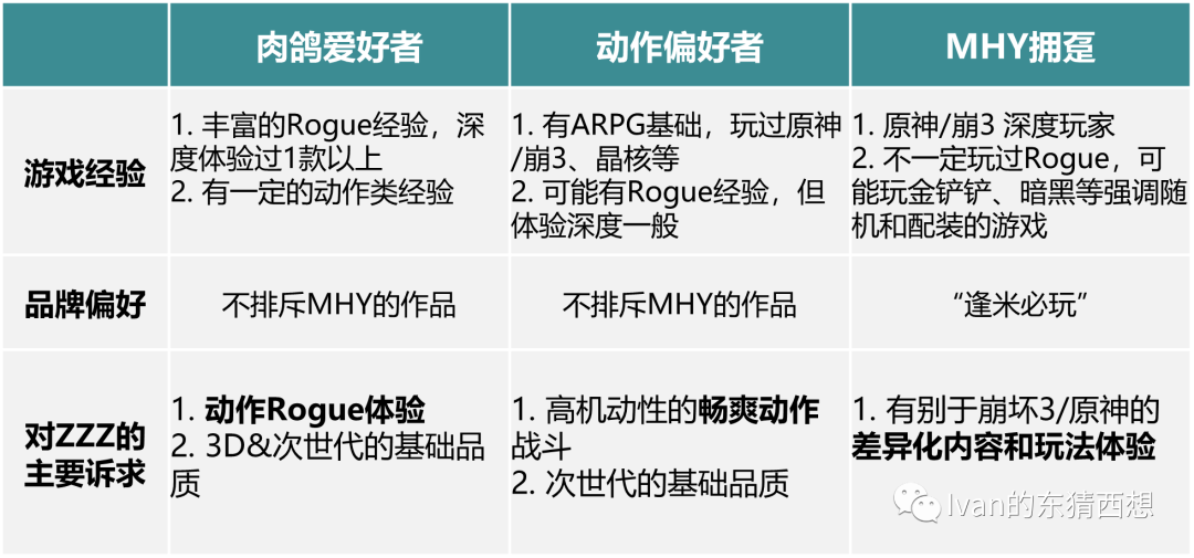 为了有所聚焦,我们从游戏和品牌偏好上将ZZZ的潜在玩家分为以下三类: