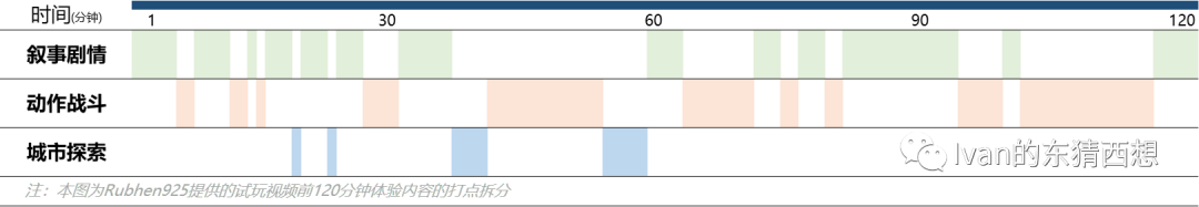 不同于大多数Rogue因为应接不暇的战斗导致正反馈的获取难度高,在ZZZ中反而是战斗体验的频次偏低引起的正反馈不足。以下是某玩家B测期间前2个小时体验内容的拆分,可以看到: