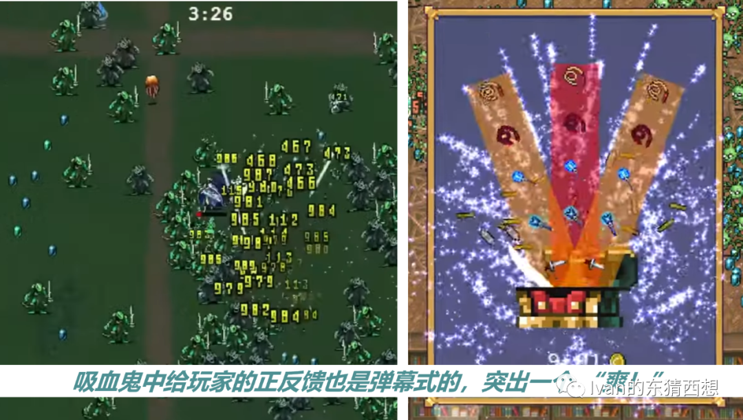 Hades通过额外的剧情和角色互动来增加正反馈来源已经是明确受到玩家认可的思路了。但席卷全球的吸血鬼幸存者则提供了更加直接粗暴的解法:“觉得慢?那我加速就完了”,比如开局5分钟内打底10次的升级强化、弹幕式的重压和收割快感下根本没时间思考快慢的事等等。