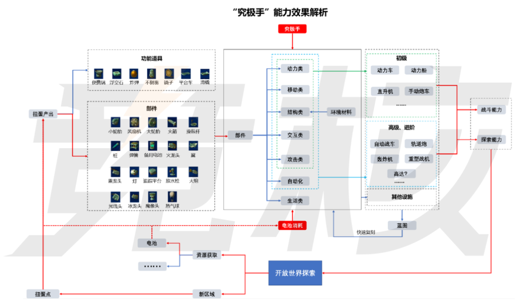 到了这里,或许很多玩家已经猜想到Takuhiro Dohta想要说的哪些《王泪》上的新功能,那便是“究极手”和“余料建造”。此前竞核也在《探索三层垂直世界,徒手捏高达,开放世界新“神”诞生》一文中简单解析了“究极手”的能力效果。