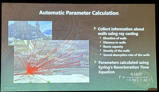 对于Junya Osada而言,那些需要刻意实现的“混响”内容,也能够如同物体物理性质自动计算一样,能够自动进行射线投射、墙壁方向、墙壁距离、房间容量、墙壁密度、墙壁吸声率等衰减计算,进而自然而然而实现出来,让玩家实时听到更为“真实”的声音。