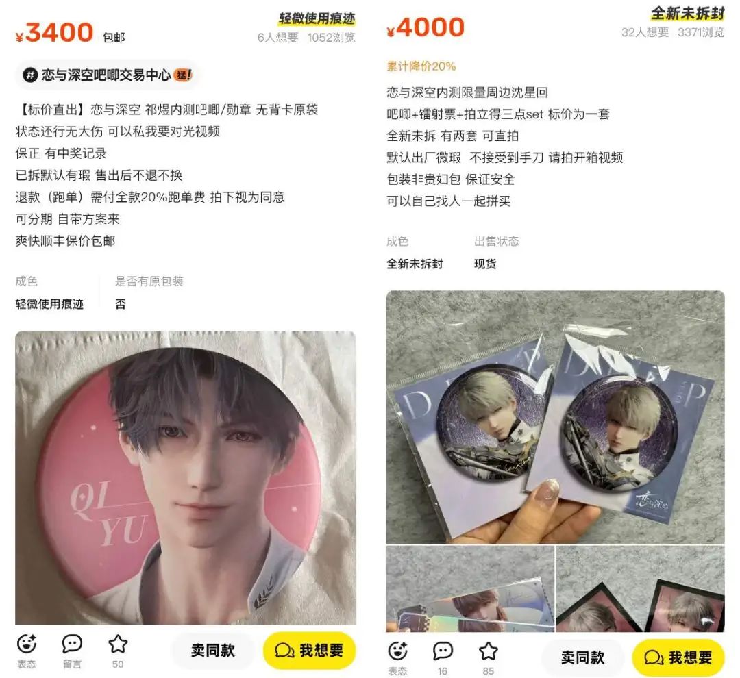 在圈子里,还有不少人对谷子珍而重之,她们秉承着收藏家的心态,任何划痕,锈迹都不被允许。在这一前提下,能扎包往往意味着经济实力。并且在常见的普通徽章之外,还有更多限定,绝版一类的存在,有了这些前缀后,谷子的价格往往水涨船高。