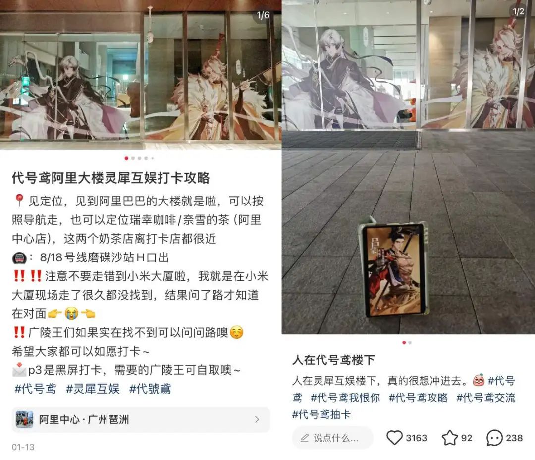 在常见的国乙产品之外,灵犀互娱的女性向《代号鸢》也很有前景。此前游戏在港澳台联动的咖啡厅收到了不少玩家的好评。国内的用户只能在互联网上看热闹,以至于广州的灵犀互娱公司都成了玩家的打卡地,只是因为楼下的玻璃墙上贴了这些游戏角色。