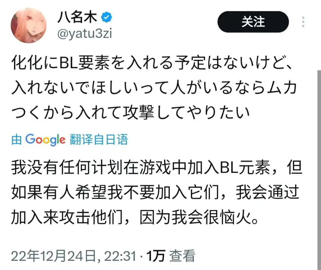 搜索社交媒体,却有另一种声音,主要集中在对游戏制作者“八名木”言论的批判。省流总结就是,国人贷款道歉惹八名木生气,扬言要在游戏里加入BL内容攻击玩家。
