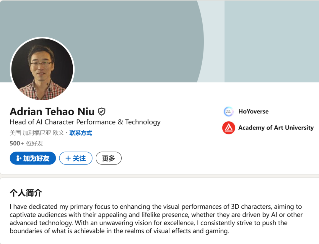 公开资料显示,Adrian Tehao Niu于2023年4月担任 HoYoverse 的AI角色视觉和技术负责人。此前,他于22年3月至23年3月在HoYoverse担任角色面部表现研发团队负责人。在加入HoYoverse之前,他于20年3月至22年4月于腾讯美国担任集中技术艺术管线开发主管。