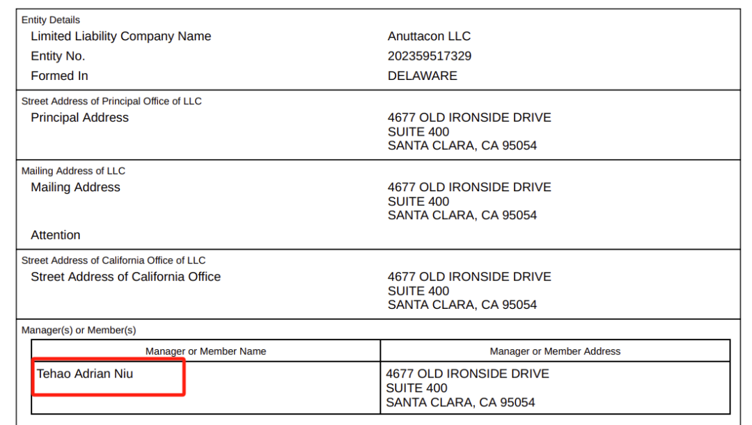 而根据加利福尼亚州州务卿办公室的资料显示,Anuttacon目前的管理者姓名为Tehao Adrian Niu。