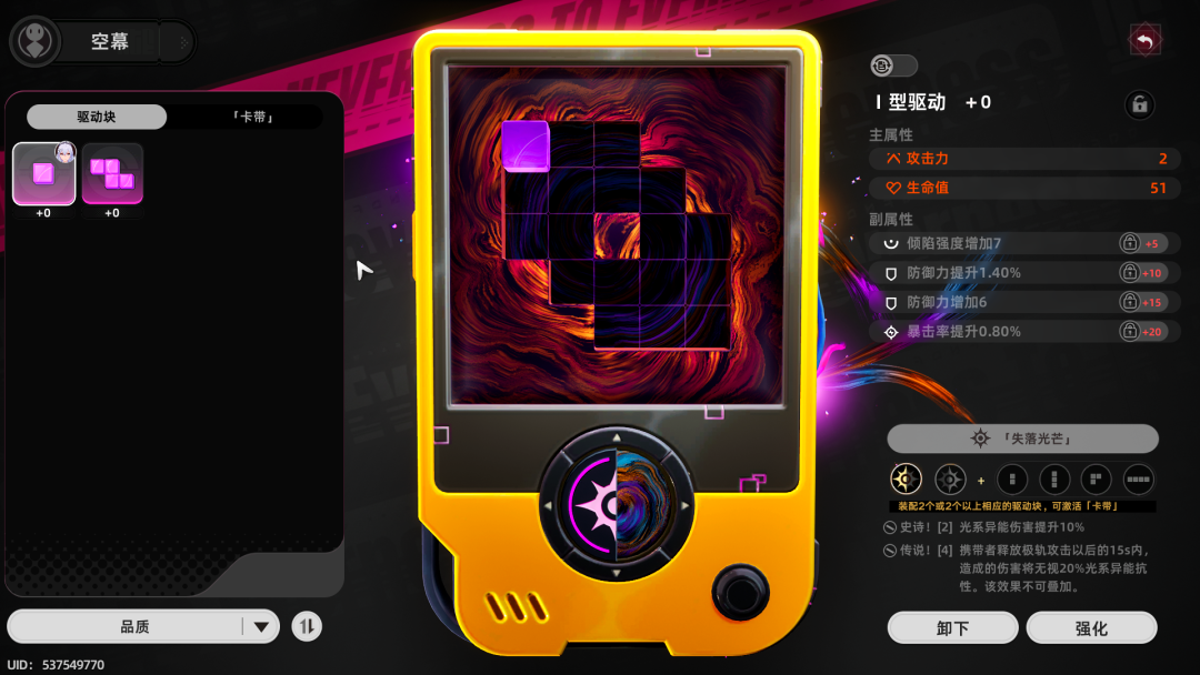 虽然还是老一套养成,例如圣遗物分为了“驱动块”,“卡带”两种类型,其中“驱动块”类似《重返未来1999》中的“共鸣”,需要玩家将形状各异的“驱动块”填满空幕,而“卡带”则类似于《崩坏:星穹铁道》的“内圈遗器”。但在一些细节上还是有所差异,例如玩家获得“驱动块”、“卡带”时,即可显示隐藏词条,大大节省了玩家养成成本。