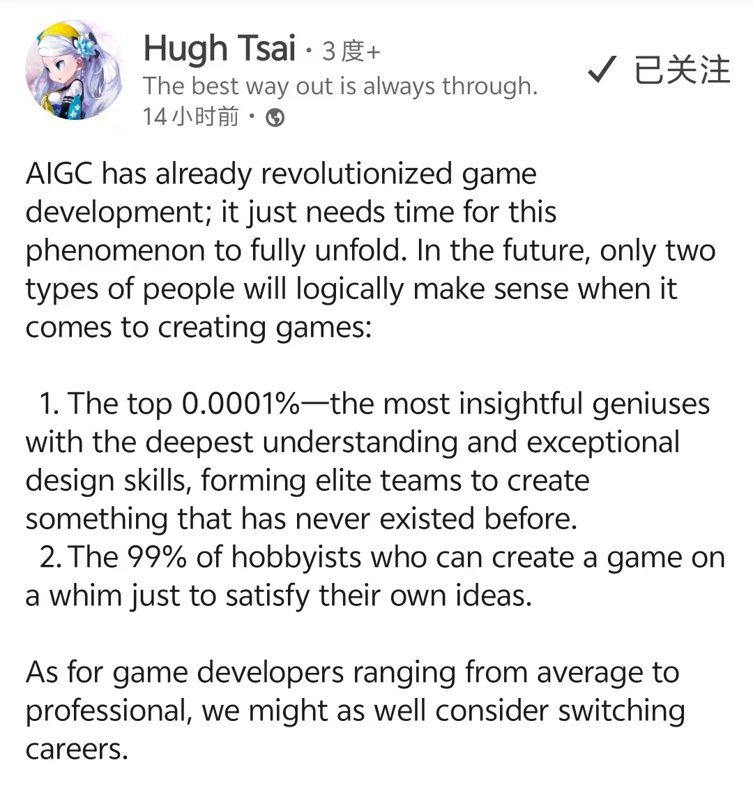 我们曾在《100页深度:游戏厂商拥抱AIGC打法迥异,降本是果不是因》中认为,AIGC有四大阶段。并判断当时已经进入了第三阶段,即AIGC应用于游戏产品研发运营。如今随着蔡浩宇,马斯克等国内外业界大牛再次推进AI与游戏的结合,或许AIGC游戏热潮会再次来临。