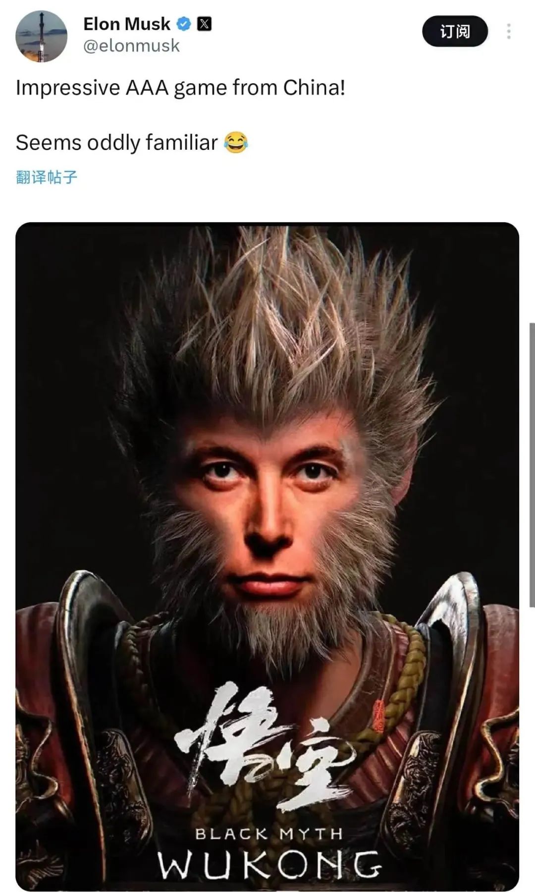 在此背景下,玩家们对马斯克能进军游戏行业有着不一样的期待。此次宣布成立AI游戏工作室,不仅表明马斯克对游戏行业现状和DEI的不满,也体现了其希望借助AI技术推动游戏行业发展。值得一提的是,早在《黑神话:悟空》发售时,马斯克就曾发布了一张用自己的脸制作的AI《黑神话:悟空》图片,同时称赞了游戏品质。换句话说,或许马斯克早就有进军AI+游戏的想法。