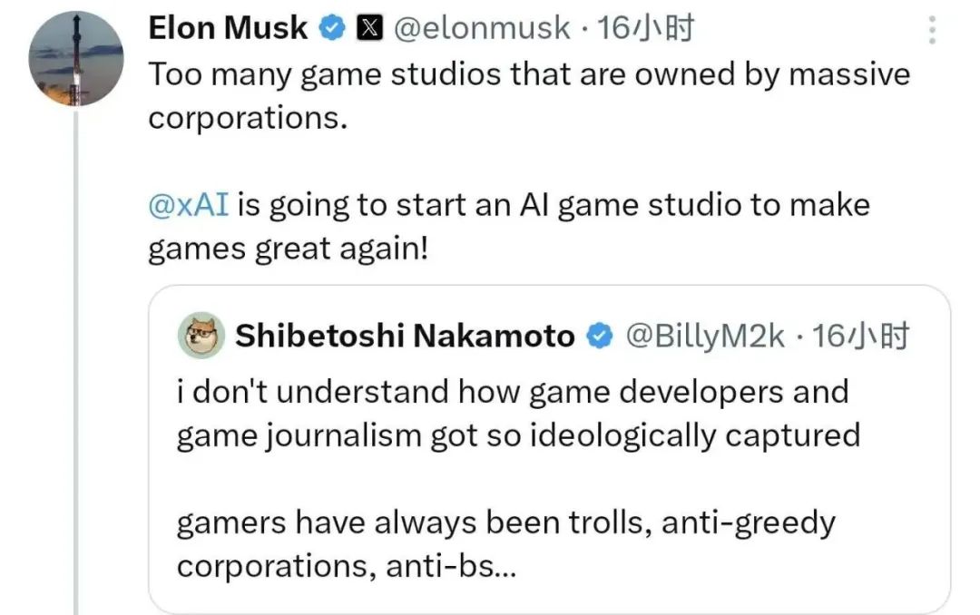 今日,埃隆·马斯克在 X 平台发文表示:“大多数游戏工作室被大型企业所控制,我旗下的 xAI 将成立一家 AI 游戏工作室,让游戏再次伟大”。