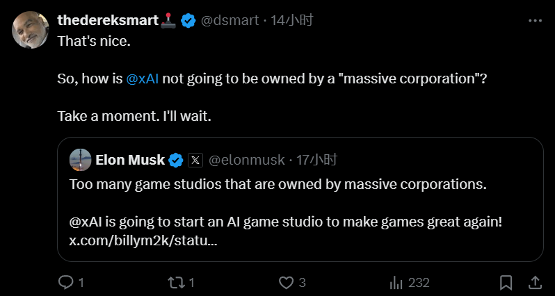 业界对于马斯克的AI游戏工作室态度则有些微妙。一方面,马斯克直接且明确的反DEI态度可以说和国外各大游戏公司都不同;另一方面,则是出自对他前半句话“大多数游戏工作室被大型企业所控制”的质疑。