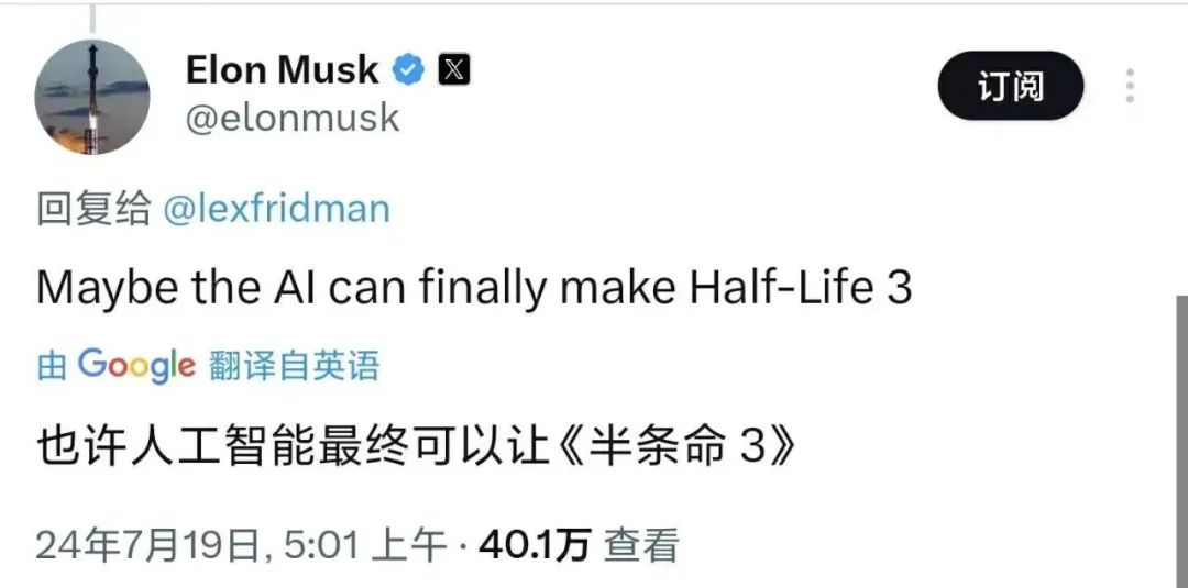 可以说,xAI的AI技术即使在国际上也属于领先地位。而马斯克最终在自己喜爱的游戏领域,选择xAI成立AI游戏工作室,也可以看出其对游戏行业未来发展的判断。他曾在X上回复称,将人工智能应用到电子游戏中,可以创造“令人难以置信”的沉浸式体验,还曾表示也许AI最终能让V社推出《半条命3》,这些都可以看出马斯克对于AI+游戏的推崇。