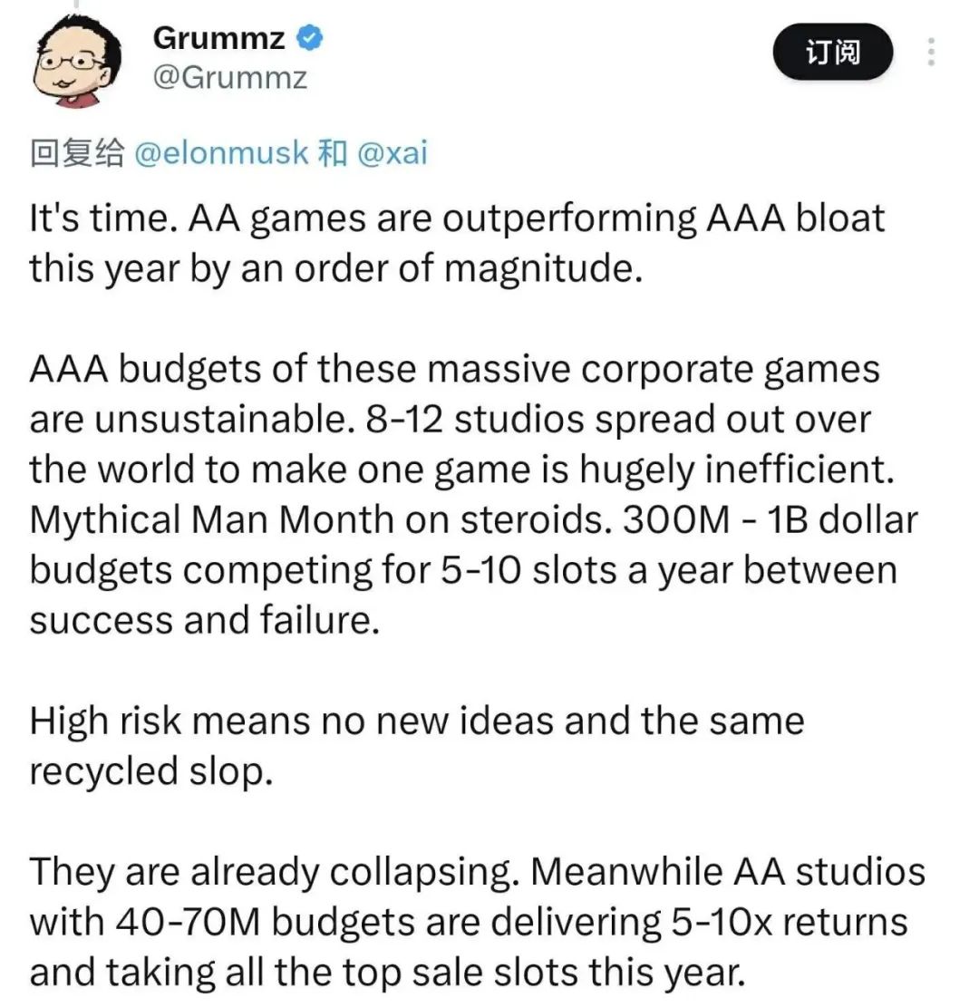 其实在今天马斯克发布的推文之后,前魔兽世界团队负责人马克·科恩(Mark Kern)就在该内容下对马斯克的声明表示赞赏。他表示,今年 AA 游戏的表现优于 AAA 游戏。3A级游戏背后的高成本、高风险、庞大的团队和预算,效率低下,经常导致创意被重复利用。