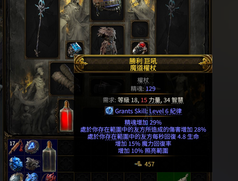 而《POE2》则体现在类似“战法牧”的职能配合上。例如战士、武僧等生存能力更强的近战的职业,可以吸引BOSS仇恨;法师、弓箭等远程职业主要负责打输出;死灵既可以召唤小怪抗伤、也可以为敌人施加Debuff,来提高友方的输出能力。而除了职能搭配外,很多装备也带有光环的辅助效果,玩家也可以根据阵容配置灵活搭配。