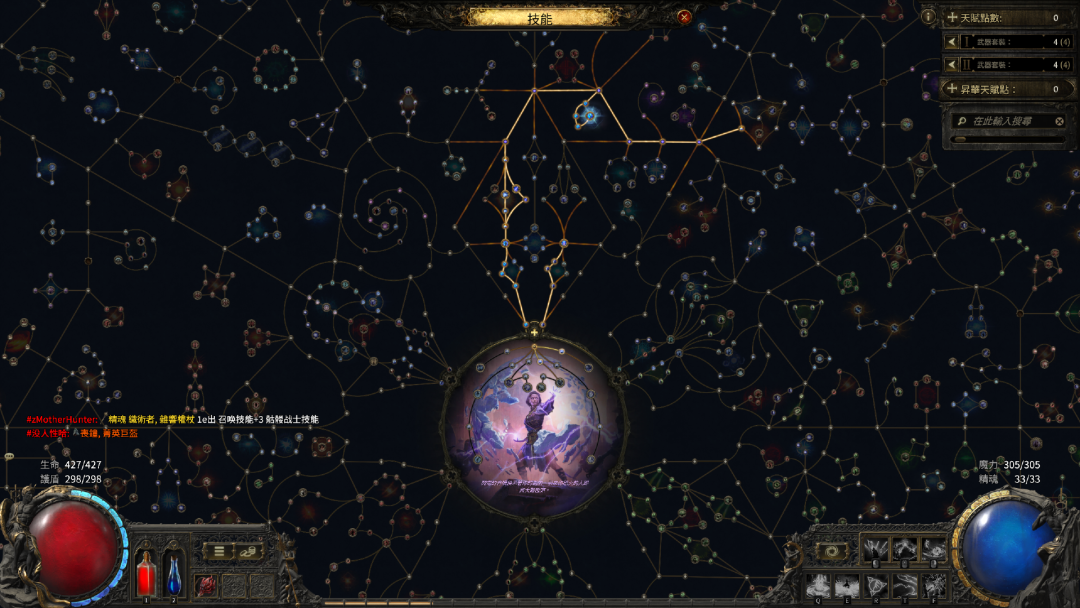 最后便是天赋部分,在天赋上《POE2》延续了前作“全职业大天赋树”的设计,虽然初期看上去会有些头疼,但一旦深入后便能够发现这是一个优秀的设计,一方面玩家的天赋不在限制于当前职业,可以通过天赋树的链接获取其他职业的天赋,而另一方面也提供了选择的策略性,究竟是花费更多的点数来学习其他职业系别方向的天赋,还是舍远求近更快的拿到本系的核心条幅,都需要玩家思考与抉择。
