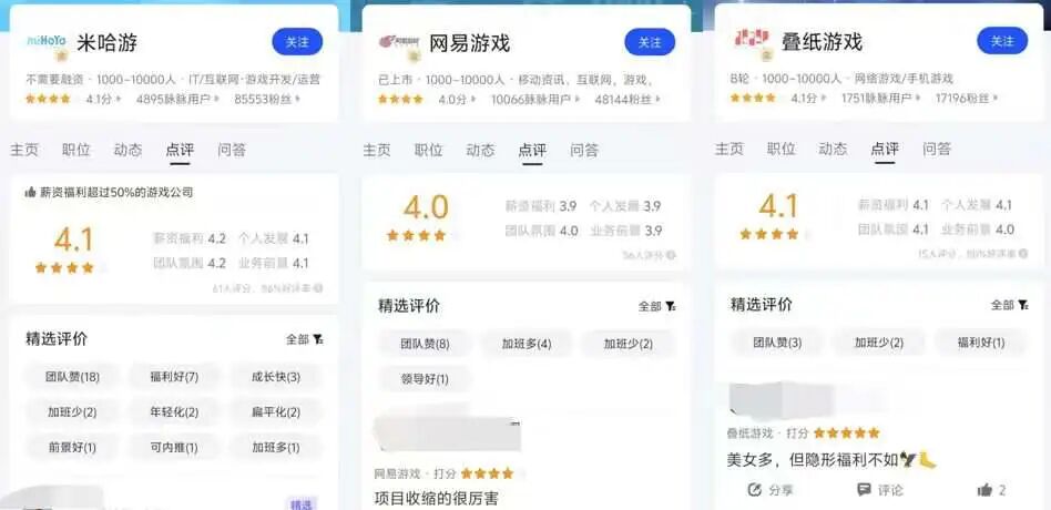 与此同时,在点评板块我们也能看到从业者对米哈游的整体评价。例如,其工资福利超过50%的游戏公司,公司综合点评分为4.1,“团队赞”、“福利好”、“年轻化”、“扁平化”、“加班多”等是从业者对其的印象标签。