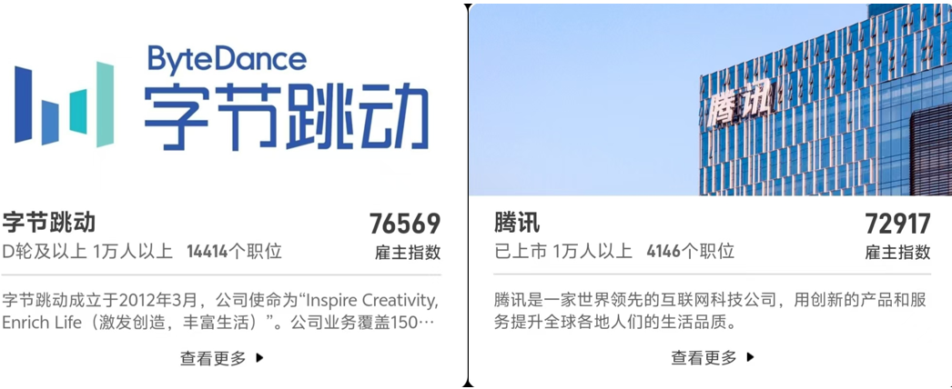 例如在本期年度职得去雇主中,字节跳动的雇主指数为76569,提供了14414个职位,公司综合点评分为4.2。腾讯的雇主指数也是高达72917,其薪资福利超过77%的互联网公司,这在游戏领域可谓是位列前茅。