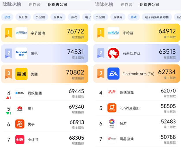 而除开年度评选外,脉脉也在热榜板块上线了“职得去公司”榜单,涵盖了总榜、飙升榜、外企榜、互联网、游戏等17个榜单。其中,字节跳动和腾讯就位列总榜前两名。具体到游戏分类的职得去公司(试运行阶段,部分公司未被收录,排名及评分仅供参考),截至目前的Top10公司依次为: