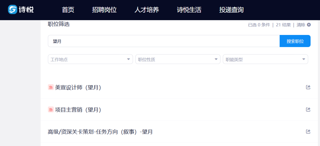在这样的情况下,《望月》项目不但没有扩招,还在年底这一节点进行裁员,似乎有些反直觉。笔者查询诗悦网络官网时发现,《望月》目前仍在急招美宣设计师和项目主营销,最新社招信息为2024年10月18日发布。