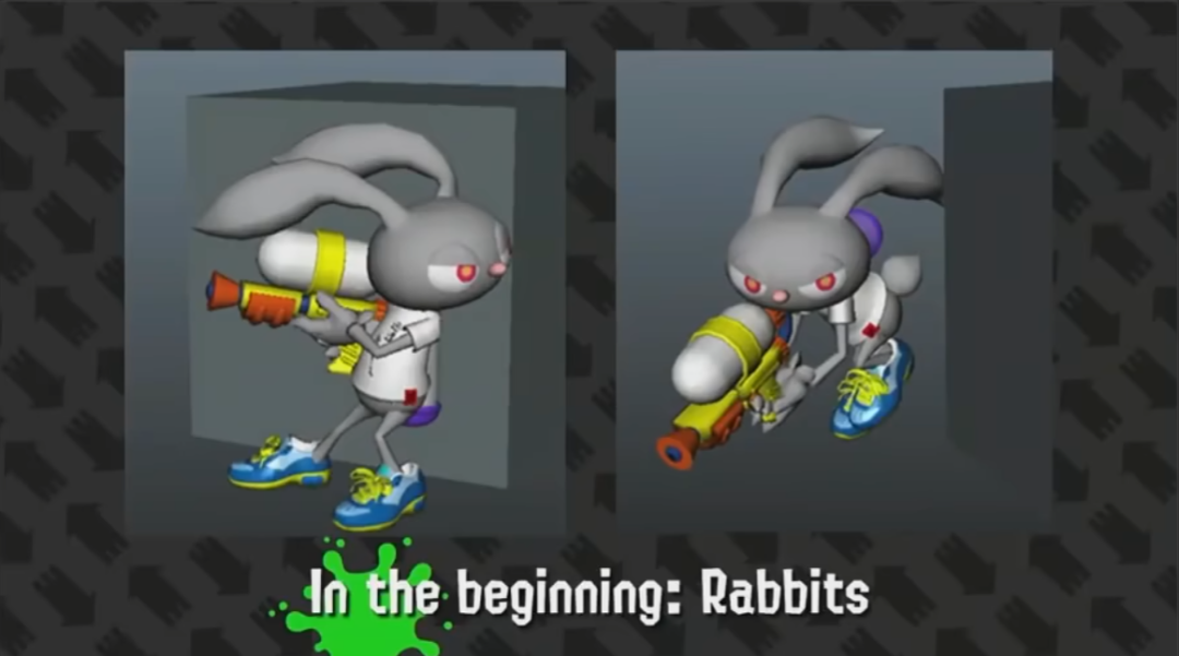而在确定玩法后,制作组开始制作角色世界观等一系列内容。但从“豆腐”变成人形就出现了无法完全隐藏自己,为什么还要涂墙壁等大量问题,制作组甚至曾考虑过用马力欧作为角色。在经历各种思索后,兔子成为了角色的原型。然而在社内测试时,“为什么兔子会涂颜料?”的问题,让制作组直接放弃了兔子的想法。