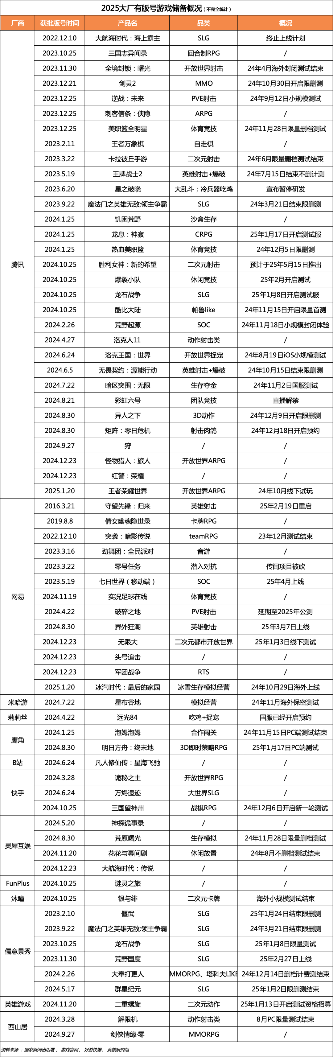据竞核不完全统计,2025年大厂有版号游戏储备概况如上图,腾讯大约有31款,包括《王者荣耀世界》《怪物猎人:旅人》《异人之下》《胜利女神:新的希望》《爆裂小队》等。网易方面大约有13款,包括《无限大》《界外狂潮》等。