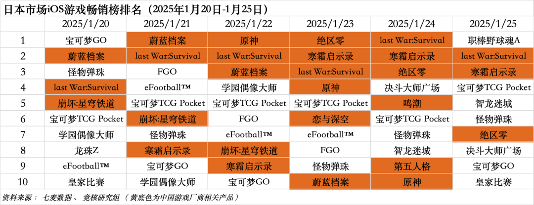 日本市场2025年1月20日-2025年1月25日iOS游戏类畅销榜中,悠星《蔚蓝档案》、米哈游《绝区零》《原神》、元趣科技《Last War:Survival》各登顶1天。